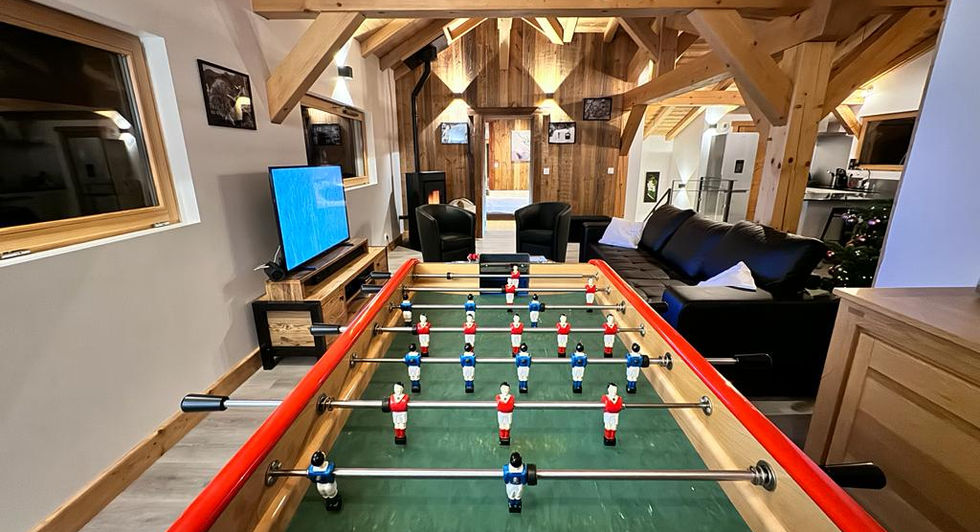 Vaste séjour avec TV grand écran, poêle à granulés, baby-foot donnant accès sur une terrasse plein Sud avec mobilier, parasol, barbecue, terrain de pétanque.